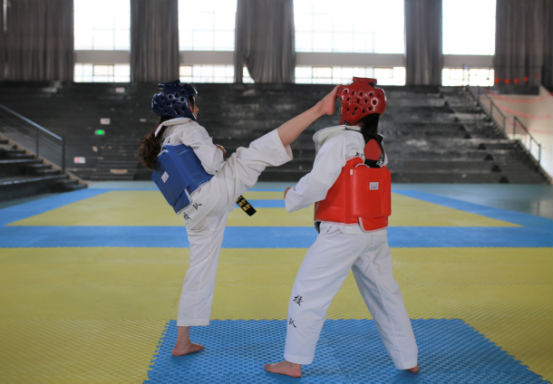 跆拳道是我校大力推广的体育项目,也是同学们的体育必修课之一,图为我校健儿刻苦训练,积极备战省级比赛。