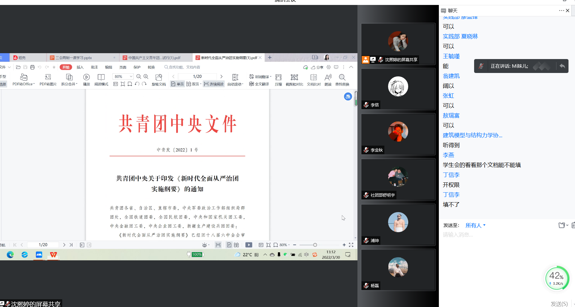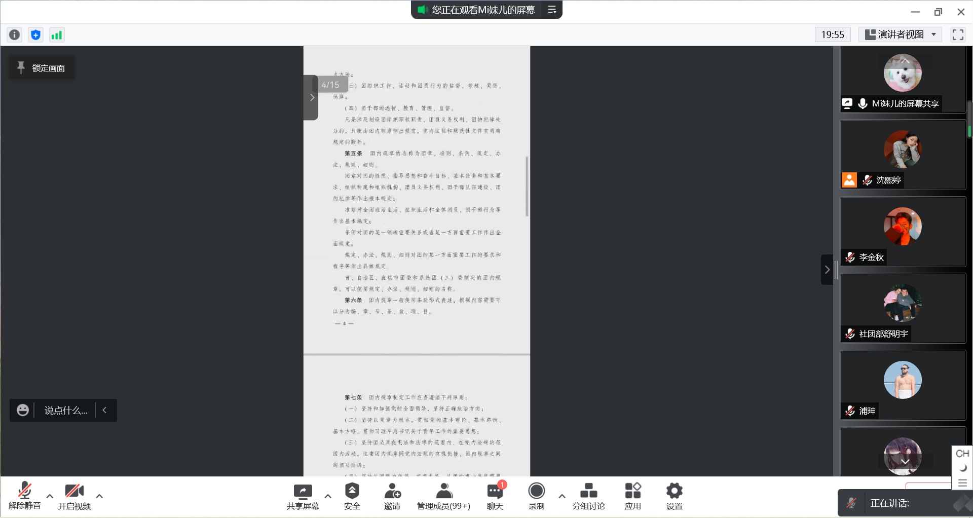 本次会议主要是对《中国共产主义青年团团内规章指定条例(试行)》、《中国共产主义青年团纪律处分条例(试行)》、《新时代全面从严治团实施纲要》三个文件解读和学习。
