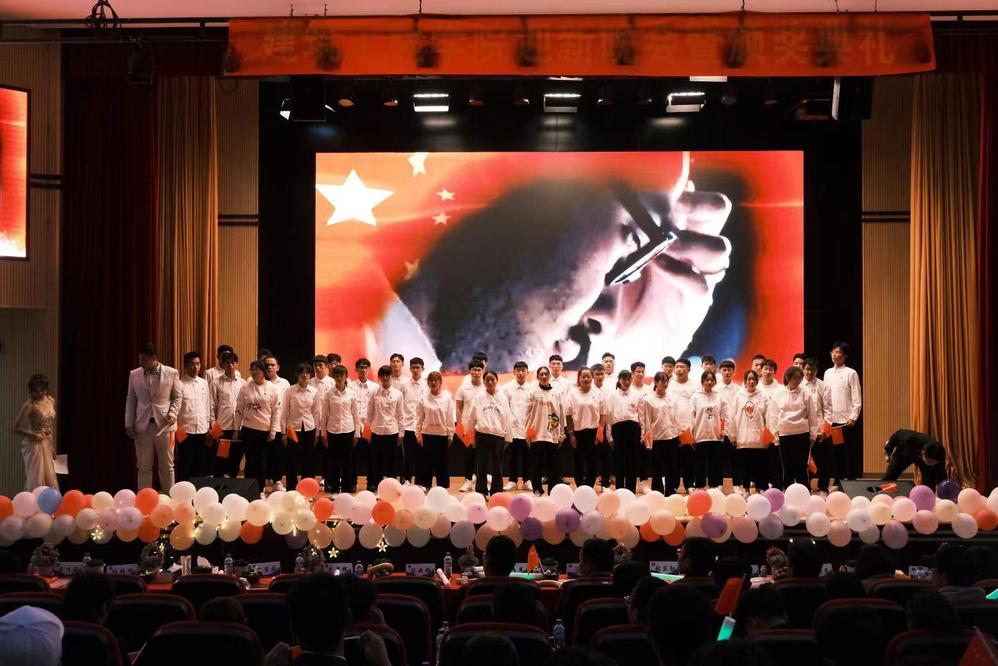 最后压轴的节目,是由建工学院同学们组织的合唱《我和我的祖国》,一听到节目的时候,在场的同学们发出了全场最热烈的惊 呼和掌声,听着这首歌,全体同学举起了手中的国旗挥舞,跟着合唱的同学一起高声歌唱,向祖国唱出自己的热情。