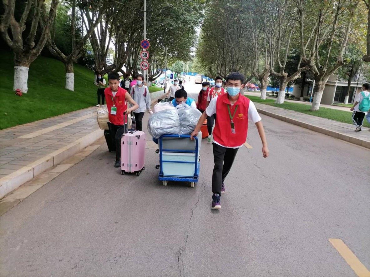 一路上志愿者更是将心比心的交代新生开学注意事宜,哪个餐厅比较好吃、图书馆在哪里、体育馆里都有什么,几乎是知无不言,言无不尽,尽显对新生的关爱之情。他们的行李则由志愿者负责看管,并且由志愿者协助搬回宿舍,志愿者们额头挥洒的汗水和昂扬高声的吆喝声是他们热情善良的代名词。