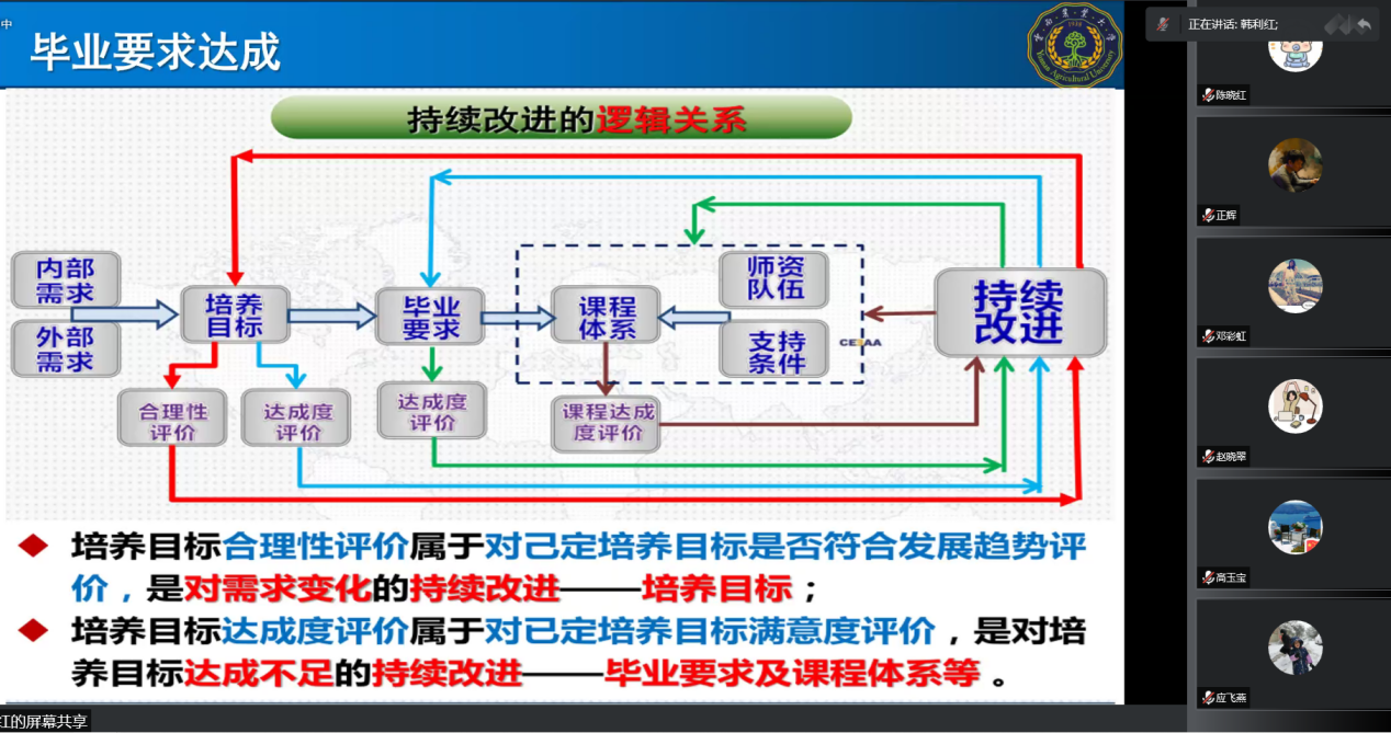 培训会伊始韩教授强调:课程是支持本科毕业要求达成和能力培养的基本教学单元;课程目标达成度评价是人才培养全过程中的重要环节,是衡量是否达到本专业毕业要求的重要依据;建立科学合理的课程评价体系是专业认证的关键工作。