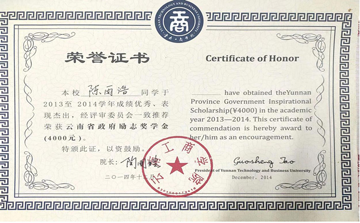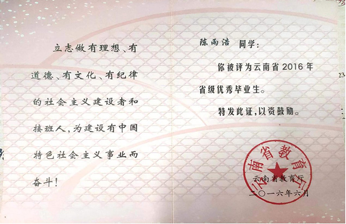 陈雨浩,男,2013级工程测量1班,现任职于普洱市澜沧县惠民镇人民政府。在校期间担任2013级工程测量1班团支部书记、工学部学生科网络编辑部副部长,连续获得2013-2014年云南省政府励志奖学金、2014-2015年云南省政府奖学金。2014年10月获得优秀共青团干部称号、2014年10月获得优秀班干部称号、2016年获得云南省优秀毕业生称号、2013届建工测量大赛团体第三名等。