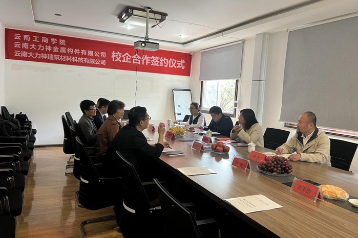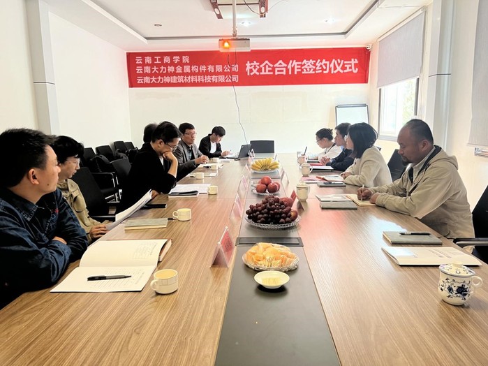 云南工商学院建筑与设计学院院长周丽萍、书记杨华、副院长林海、土木系系主任和金兰、辅导员老师张玉珊,云南大力神金属构件有限公司董事长孙成林、副总经理刘源、总经理助理石璞、总工程师陈亮,云南大力神建筑材料科技有限公司总经理杨家智、副总经理张平贵、副总经理宋瑞参加本次会议。
