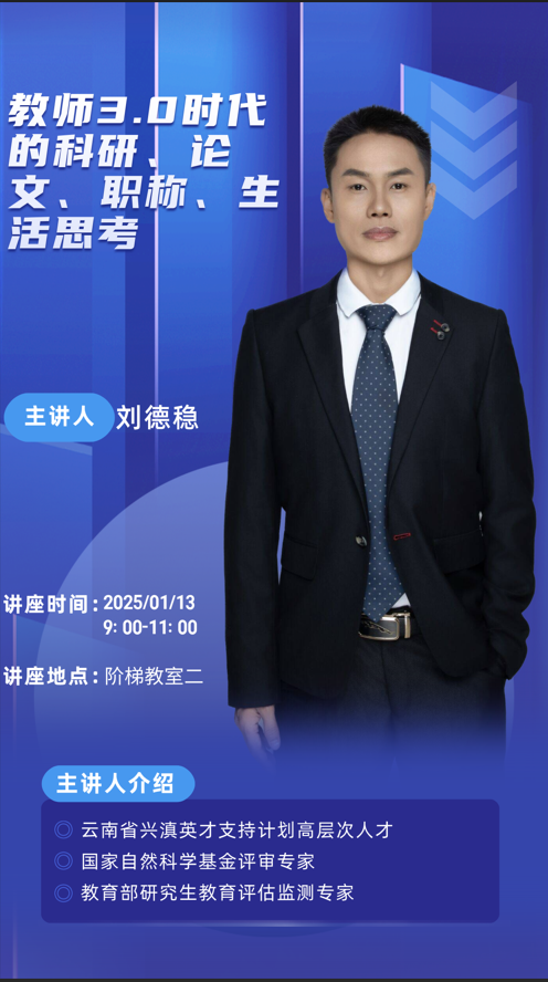 建筑与设计学院在学术探索与人才培育的道路上一路奋进,始终聚焦于前沿领域,为师生搭建多元成长平台。2025 年 1 月 13 日上午 9:00,学院有幸邀请到西南林业大学资深教授刘德稳,举办了一场主题为“教师3.0时代:科研、论文、职称与生活新思考”的精彩专题讲座。