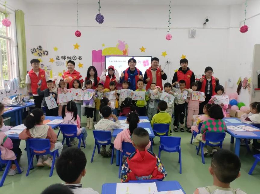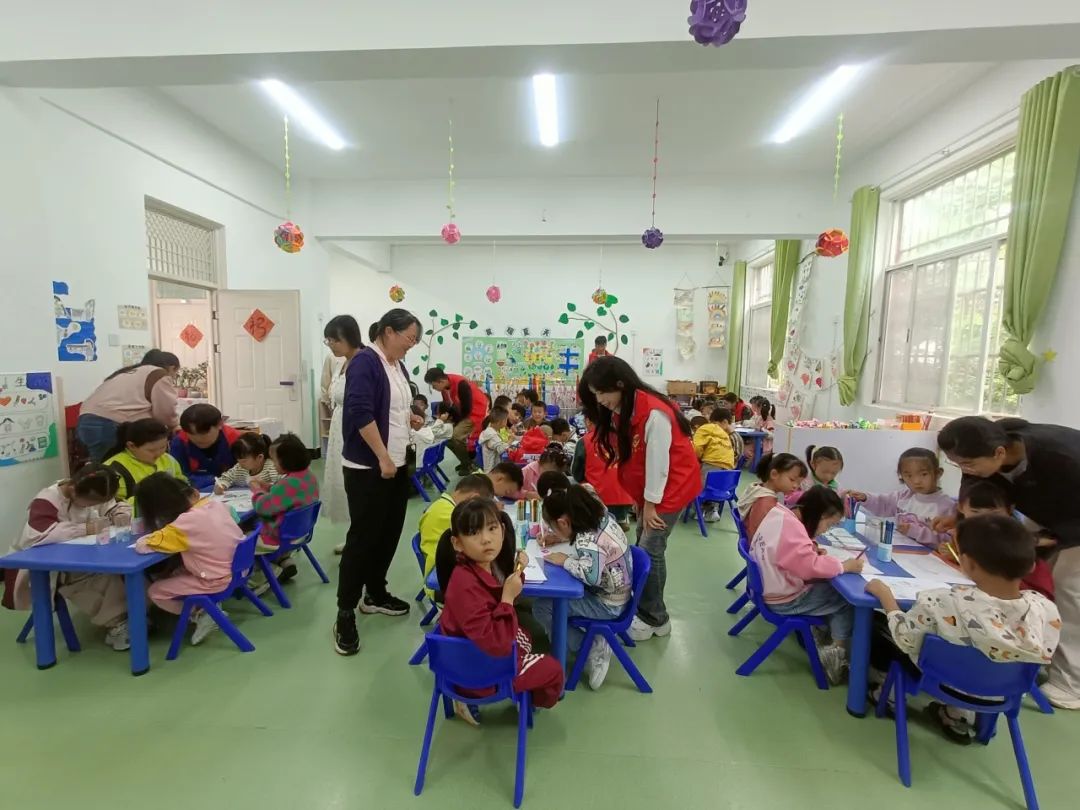 在上游小学附属幼儿园,学院志愿者们化身“美育小老师”,通过生动的画面和讲解,带领孩子们走进中国簪花的魅力世界。孩子们围坐桌前,手握彩笔,小脸上写满专注与喜悦。志愿者们俯身指导,用丰富的表情和生动的语言与孩子们积极互动,激发无限想象。窗外细雨绵绵,室内创意飞扬。一幅幅充满童趣的簪花作品跃然纸上。完成创作后,孩子们兴奋地高举画作,期待“小老师”的点评和心仪的奖品。这堂“童画课”不仅丰富了孩子们的课余生活,更在幼小的心灵深处悄然播下了热爱美、创造美的种子。