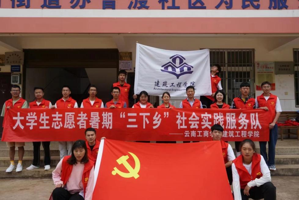 2022年7月8日,由中共云南工商学院建筑工程学院学生第一党支部17名师生党员组成的“乡村振兴有我”志愿者先锋队在昆明市嵩明县小街镇普渡村开展“三下乡”暑期社会实践活动。志愿者在村政府门口留影 志愿者们聚力认知乡村、了解基层社会治理现状,生态文明建设等领域走进千家万户深入走访。旨在把生态文明建设融入乡村...
